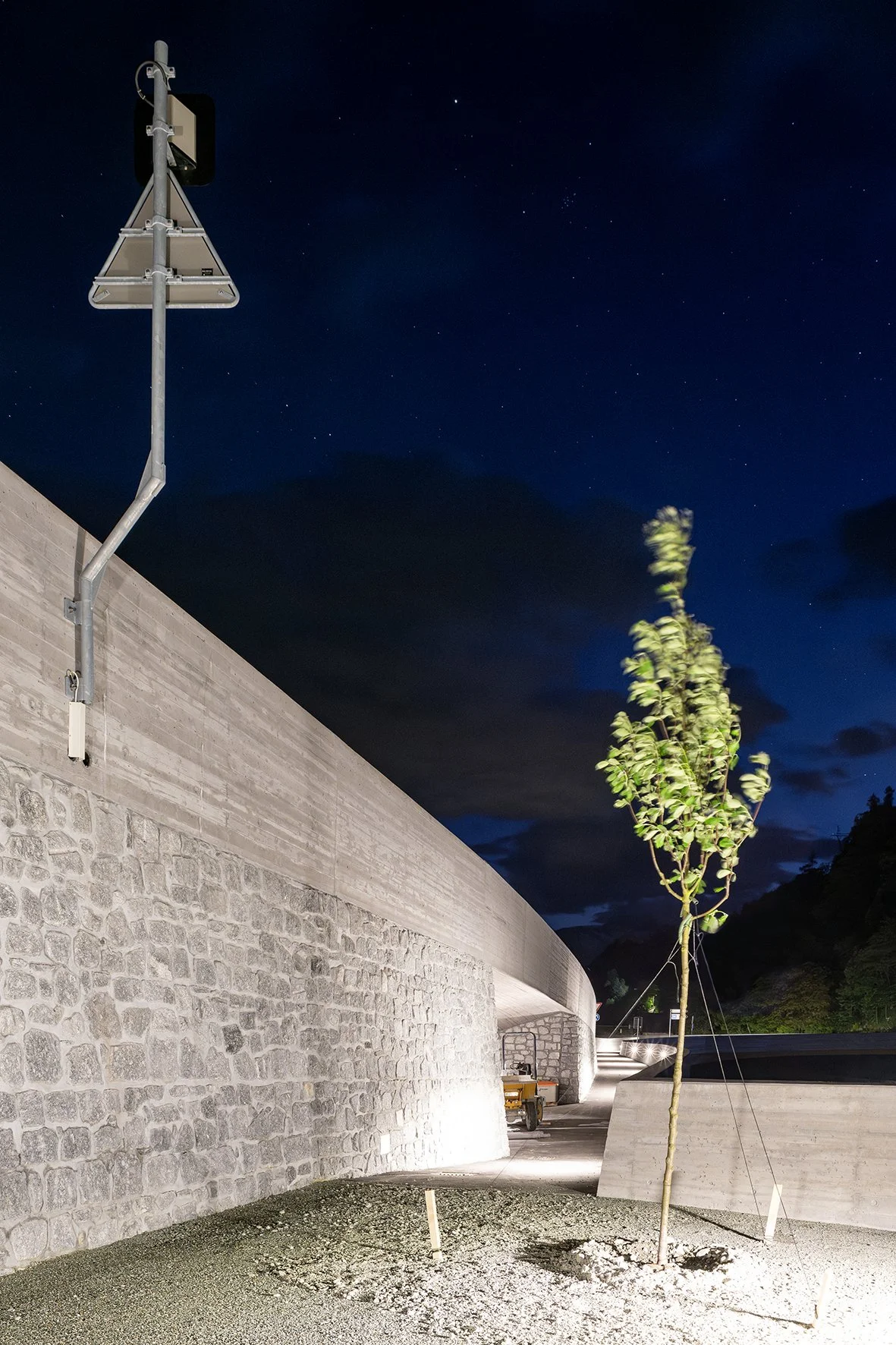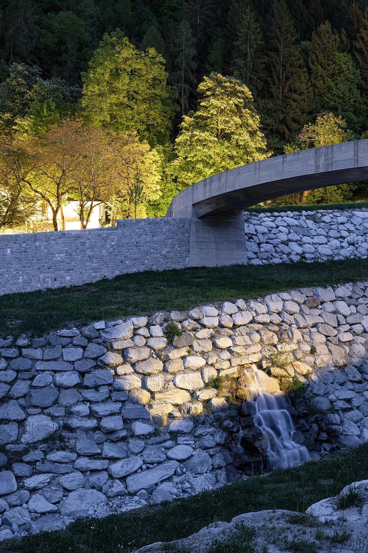 Bauherrschaft: Gemeinde Bergell / Gesamtprojektleitung: Tiefbauamt Graubünden / Planung: Arge «strata» (Projektleitung: Conzett Bronzini Partner, Chur / Wasserbau: Eichenberger Revital, Chur / Strassenbau: Caprez Ingenieure, Silvaplana / Landschaftsarchitektur: mavo, Zürich, Müller Illien, Zürich / Architektur: Conradin Clavuot, Chur).